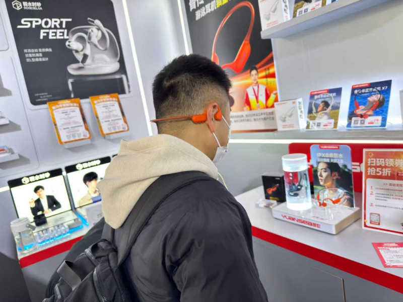 在展位现场,原世设置了产品体验区,摆放了多款骨传导运动耳机。消费者可以亲自试戴,感受超轻机身带来的无负担佩戴体验,搭配高弹钛合金机架与柔软硅胶耳挂,即便长时间佩戴也不会产生夹耳感。可以连接设备播放音乐,直观感受开放双耳设计的优势,无需堵塞耳道,就能清晰聆听音乐,实时捕捉周围环境音,无论是跑步还是健身都能兼顾安全与听觉享受。