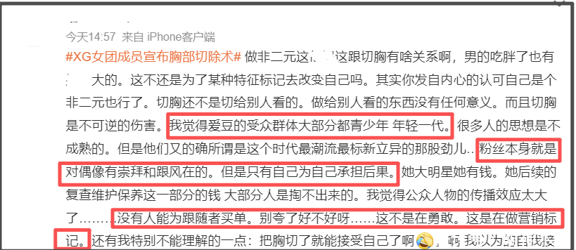 XG虽然称不上大红大紫,但还是有粉丝的,在COCONA本人都认知混乱的情况下,XG组合制作人和公司都站出来表示支持,大肆炒作宣传,很容易对未成年粉丝产生负面引导。