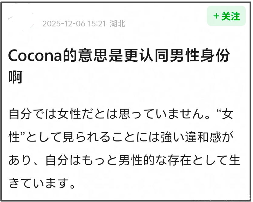 正如网友所说,COCONA自曝接受手术的时候提到三个重点,不觉得自己是女性;被作为女性看待困难有违和感;自己想作为更男性化的存在生存。