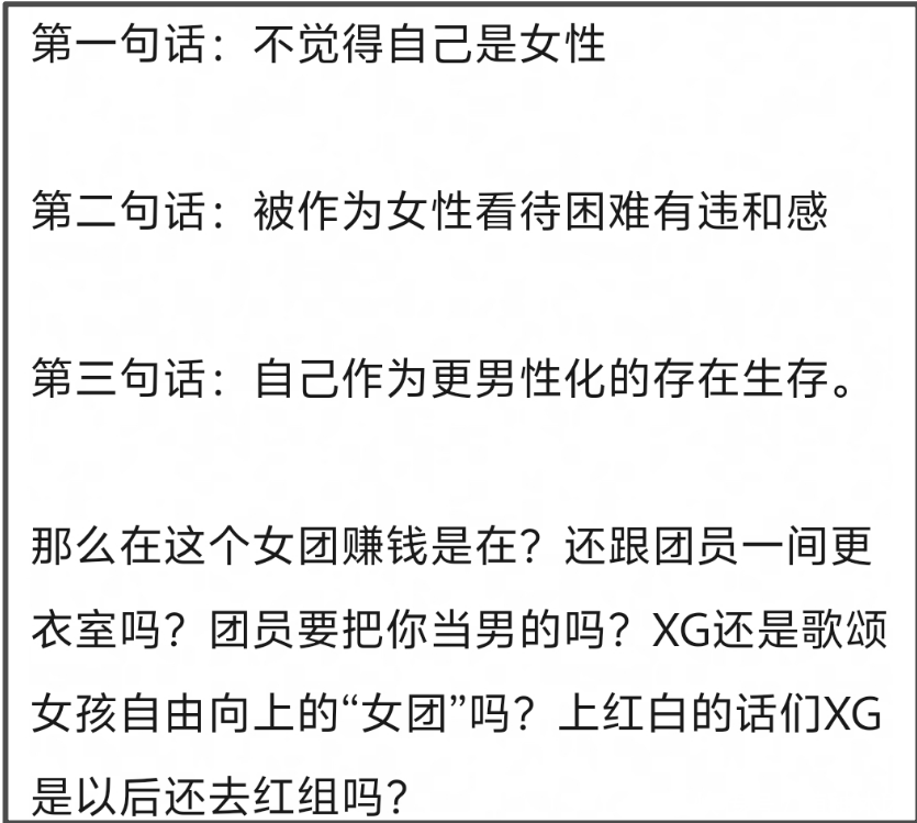 那么问题来了,既然COCONA想当男的,为什么要参加女团呢?接下来,COCONA又要以什么身份和队友相处,其他六位成员都是实打实的女生,整个团体的名字XG指的就是“Xtraordinary Girls”——Girls的意思就是女孩呀!